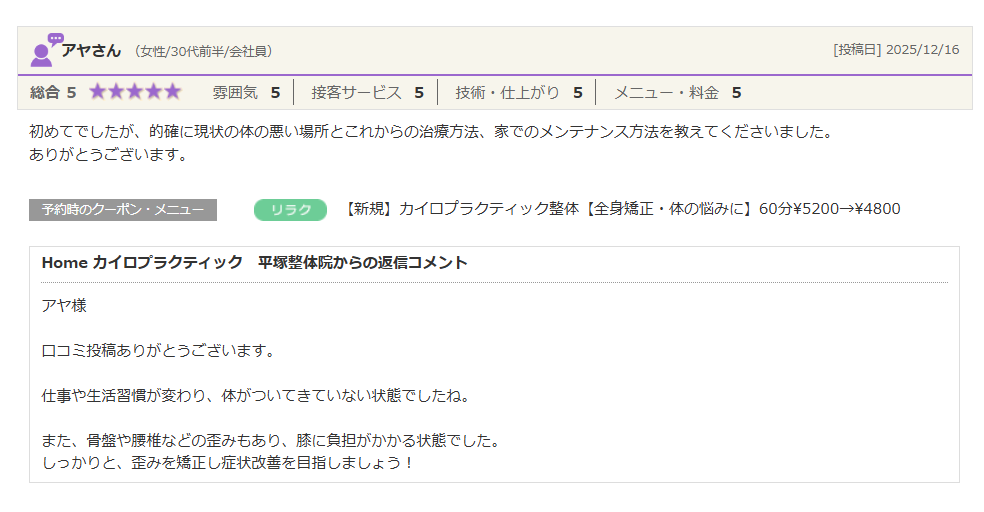 初めてでしたが、的確に現状の体の悪い場所とこれからの治療方法、家でのメンテナンス方法を教えてくださいました。