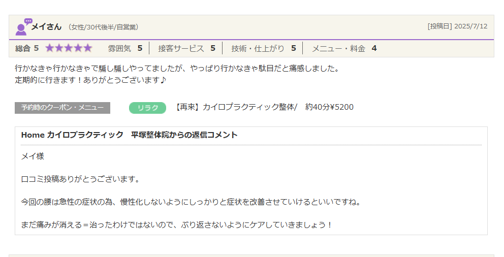 2025/7/12 めいさん 【メニュー】カイロプラクティック整体