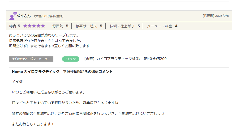 2025/9/6 メイさん 【メニュー】カイロプラクティック整体