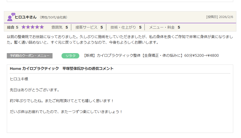以前の整骨院でお世話になっておりました。久しぶりに施術をしていただきましたが、私の身体を良くご存知で非常に身体が楽になりました。暫く通い詰めないと、すぐ元に戻ってしまうようなので、今後もよろしくお願いします。